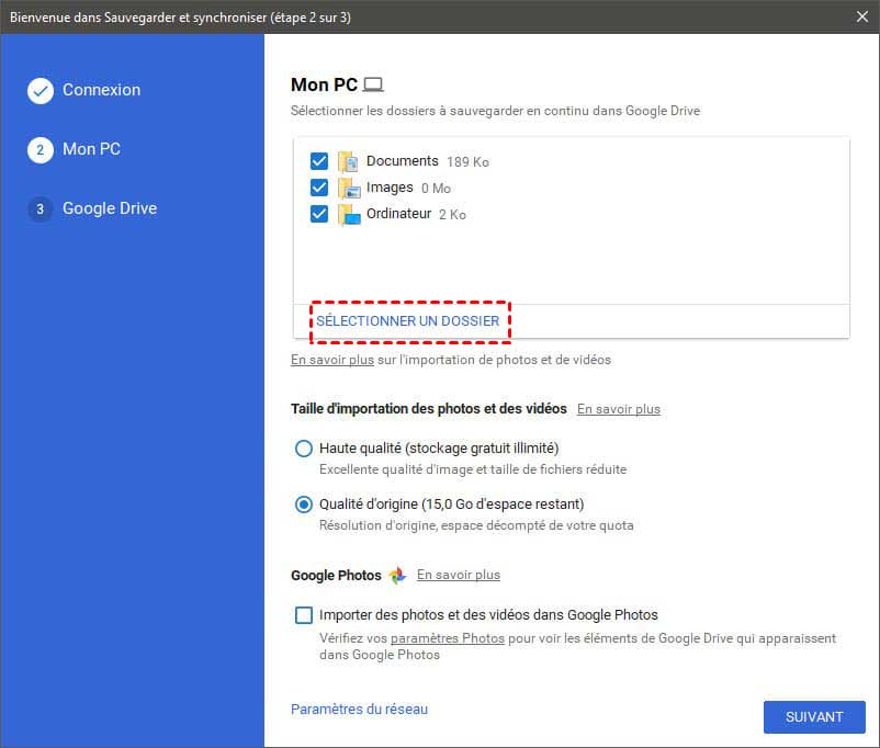 2. Dans la section mon pc, sélectionnez le dossier local que vous souhaitez synchroniser avec Google Drive. De plus, vous pouvez spécifier la taille des téléchargements de photos et de vidéos. Ensuite, cliquez sur suivant pour continuer.